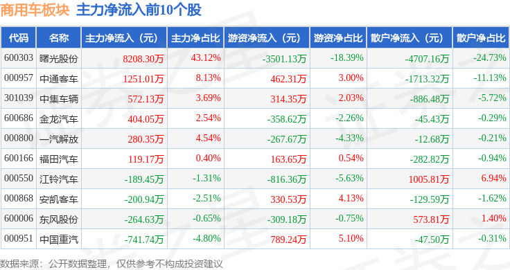 从资金流向上来看,当日商用车板块主力资金净流出2.91亿元,游资资金净流入5737.61万元,散户资金净流入2.34亿元。商用车板块个股资金流向见下表: