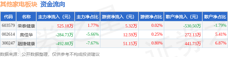 从资金流向上来看,当日其他家电板块主力资金净流出252.43万元,游资资金净流入69.07万元,散户资金净流入183.36万元。其他家电板块个股资金流向见下表:
