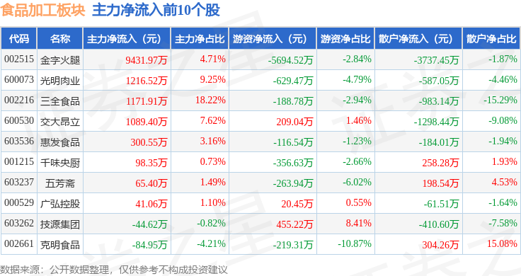 从资金流向上来看,当日食品加工板块主力资金净流出1835.41万元,游资资金净流出4715.9万元,散户资金净流入6551.32万元。食品加工板块个股资金流向见下表: