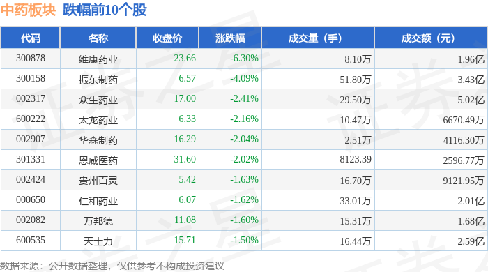 证券之星消息,9月26日中药板块较上一交易日下跌0.38%,维康药业领跌。当日上证指数报收于3828.11,下跌0.65%。深证成指报收于13209.0,下跌1.76%。中药板块个股涨跌见下表: