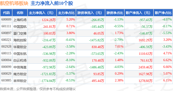 从资金流向上来看,当日航空机场板块主力资金净流出9751.93万元,游资资金净流出1252.05万元,散户资金净流入1.1亿元。航空机场板块个股资金流向见下表: