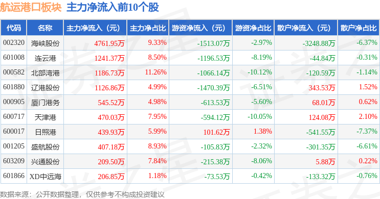 从资金流向上来看,当日航运港口板块主力资金净流出1.7亿元,游资资金净流出1.34亿元,散户资金净流入3.05亿元。航运港口板块个股资金流向见下表: