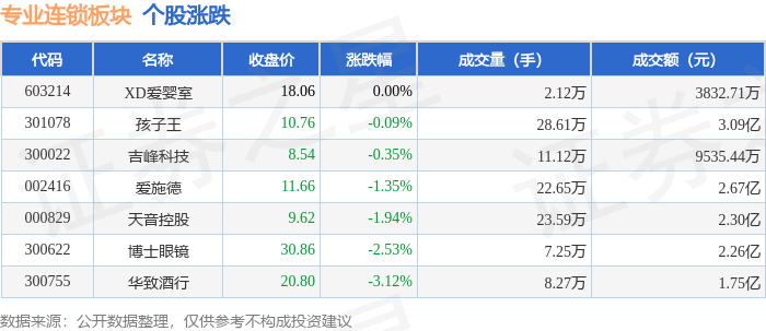 证券之星消息,9月26日专业连锁板块较上一交易日下跌1.43%,华致酒行领跌。当日上证指数报收于3828.11,下跌0.65%。深证成指报收于13209.0,下跌1.76%。专业连锁板块个股涨跌见下表: