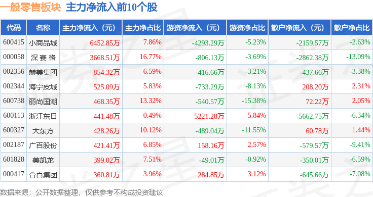 从资金流向上来看,当日一般零售板块主力资金净流出4.3亿元,游资资金净流出2647.54万元,散户资金净流入4.57亿元。一般零售板块个股资金流向见下表: