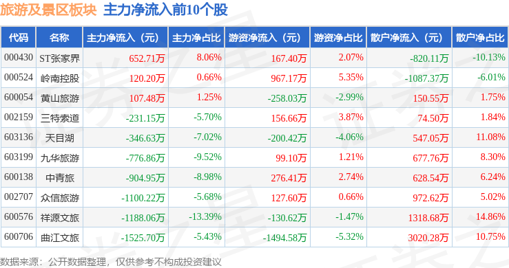 从资金流向上来看,当日旅游及景区板块主力资金净流出5.6亿元,游资资金净流入4503.03万元,散户资金净流入5.15亿元。旅游及景区板块个股资金流向见下表: