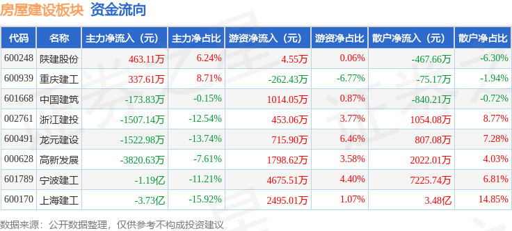 从资金流向上来看,当日房屋建设板块主力资金净流出5.54亿元,游资资金净流入1.09亿元,散户资金净流入4.45亿元。房屋建设板块个股资金流向见下表: