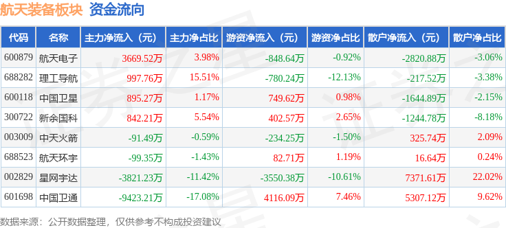 从资金流向上来看,当日航天装备板块主力资金净流出7030.52万元,游资资金净流出62.51万元,散户资金净流入7093.03万元。航天装备板块个股资金流向见下表: