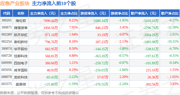 从资金流向上来看,当日应急产业板块主力资金净流出8.27亿元,游资资金净流出8967.3万元,散户资金净流入9.16亿元。应急产业板块个股资金流向见下表: