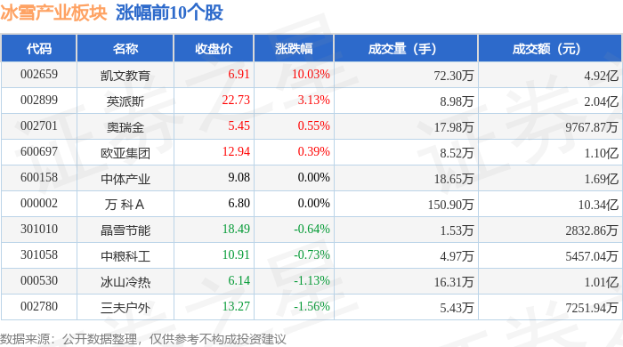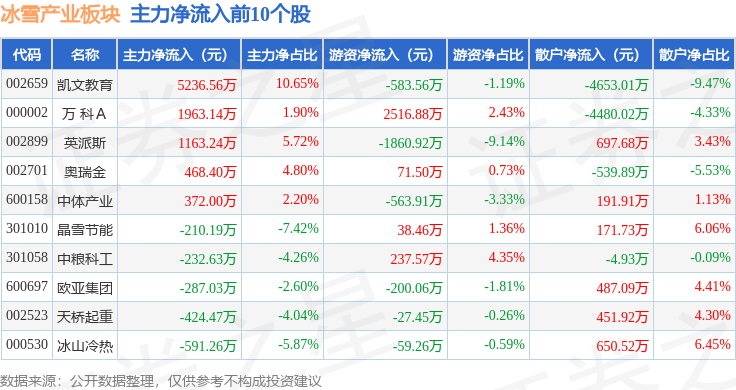 从资金流向上来看,当日冰雪产业板块主力资金净流出3.27亿元,游资资金净流入2020.15万元,散户资金净流入3.06亿元。冰雪产业板块个股资金流向见下表: