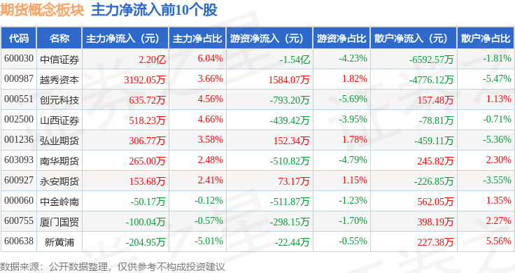 从资金流向上来看,当日期货概念板块主力资金净流出1.52亿元,游资资金净流出1.04亿元,散户资金净流入2.56亿元。期货概念板块个股资金流向见下表:
