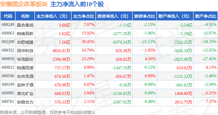 从资金流向上来看,当日安徽国企改革板块主力资金净流入6436.82万元,游资资金净流入6241.99万元,散户资金净流出1.27亿元。安徽国企改革板块个股资金流向见下表: