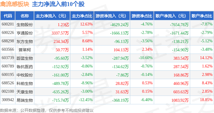 从资金流向上来看,当日禽流感板块主力资金净流入1.13亿元,游资资金净流出5809.62万元,散户资金净流出5534.57万元。禽流感板块个股资金流向见下表: