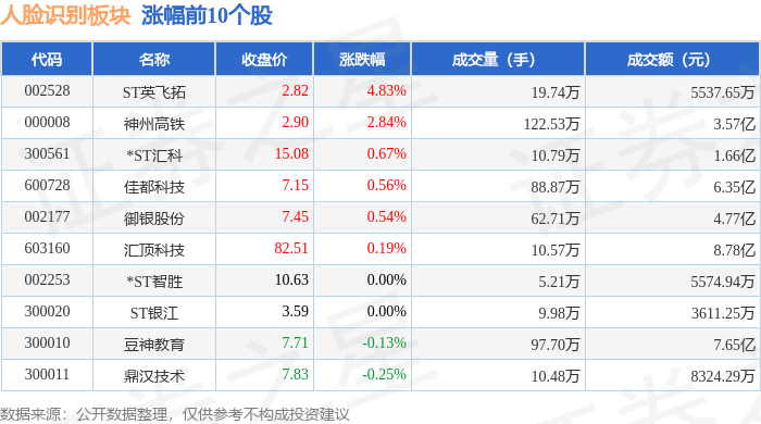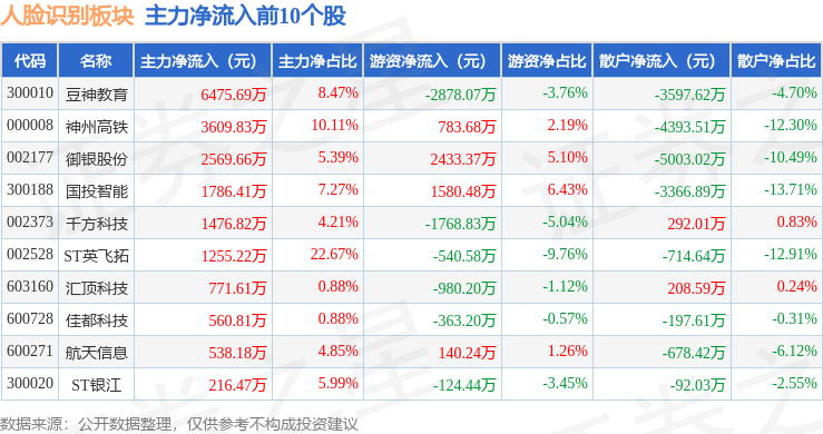 从资金流向上来看,当日人脸识别板块主力资金净流出22.84亿元,游资资金净流入6.39亿元,散户资金净流入16.45亿元。人脸识别板块个股资金流向见下表: