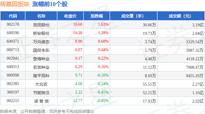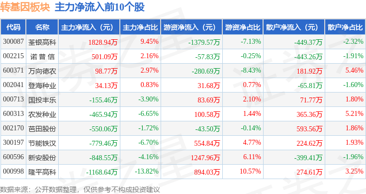 从资金流向上来看,当日转基因板块主力资金净流出3680.09万元,游资资金净流入2583.73万元,散户资金净流入1096.36万元。转基因板块个股资金流向见下表: