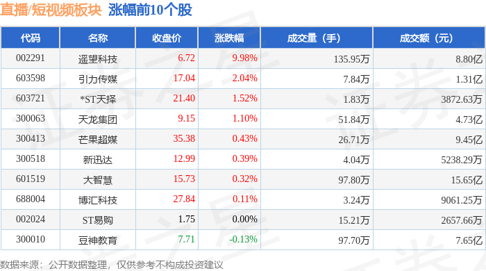 从资金流向上来看,当日直播/短视频板块主力资金净流出9.04亿元,游资资金净流出2923.58万元,散户资金净流入9.33亿元。直播/短视频板块个股资金流向见下表: