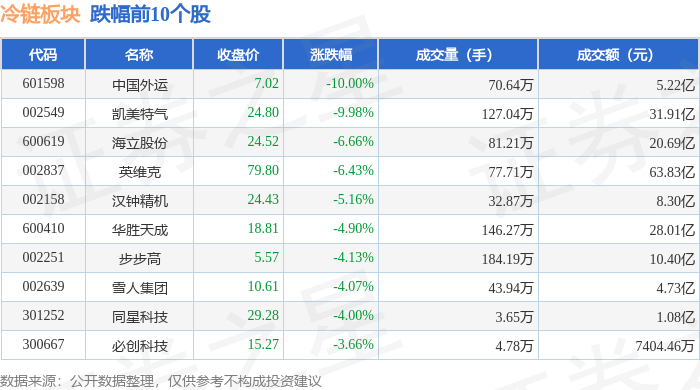 证券之星消息,9月26日冷链板块较上一交易日下跌1.54%,中国外运领跌。当日上证指数报收于3828.11,下跌0.65%。深证成指报收于13209.0,下跌1.76%。冷链板块个股涨跌见下表: