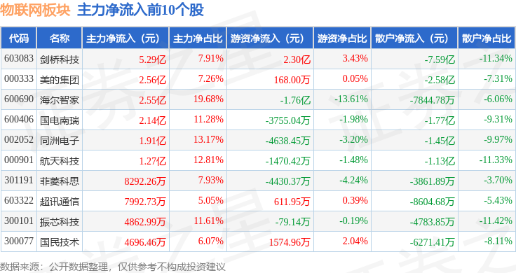 从资金流向上来看,当日物联网板块主力资金净流出145.59亿元,游资资金净流入37.37亿元,散户资金净流入108.22亿元。物联网板块个股资金流向见下表: