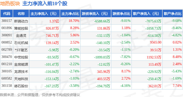 从资金流向上来看,当日地热板块主力资金净流出3.95亿元,游资资金净流出2228.33万元,散户资金净流入4.17亿元。地热板块个股资金流向见下表: