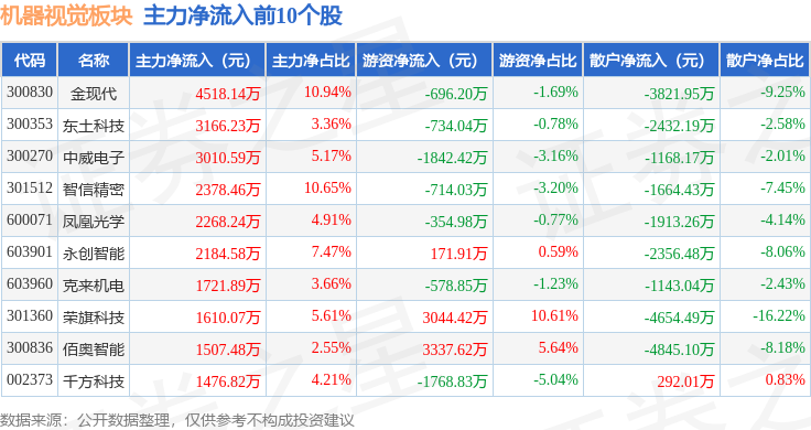 从资金流向上来看,当日机器视觉板块主力资金净流出59.23亿元,游资资金净流入16.62亿元,散户资金净流入42.61亿元。机器视觉板块个股资金流向见下表: