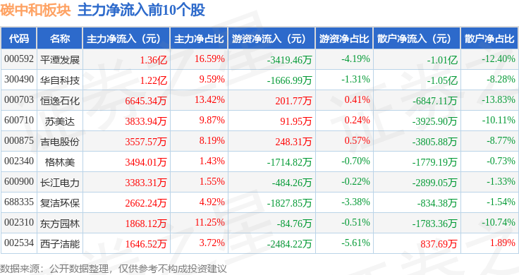 从资金流向上来看,当日碳中和板块主力资金净流出34.17亿元,游资资金净流入11.83亿元,散户资金净流入22.35亿元。碳中和板块个股资金流向见下表: