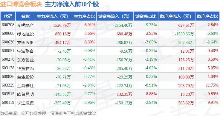 从资金流向上来看,当日进口博览会板块主力资金净流出1557.74万元,游资资金净流出682.08万元,散户资金净流入2239.83万元。进口博览会板块个股资金流向见下表: