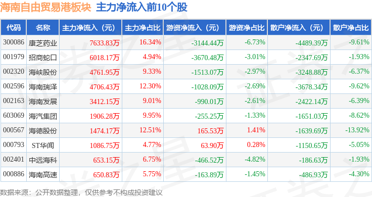从资金流向上来看,当日海南自由贸易港板块主力资金净流入2.29亿元,游资资金净流出2.0亿元,散户资金净流出2914.8万元。海南自由贸易港板块个股资金流向见下表: