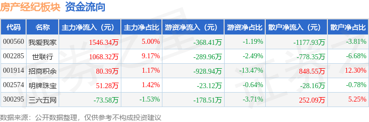 从资金流向上来看,当日房产经纪板块主力资金净流入2672.75万元,游资资金净流出1788.95万元,散户资金净流出883.8万元。房产经纪板块个股资金流向见下表: