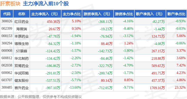 从资金流向上来看,当日肝素板块主力资金净流出3.67亿元,游资资金净流入2577.64万元,散户资金净流入3.41亿元。肝素板块个股资金流向见下表: