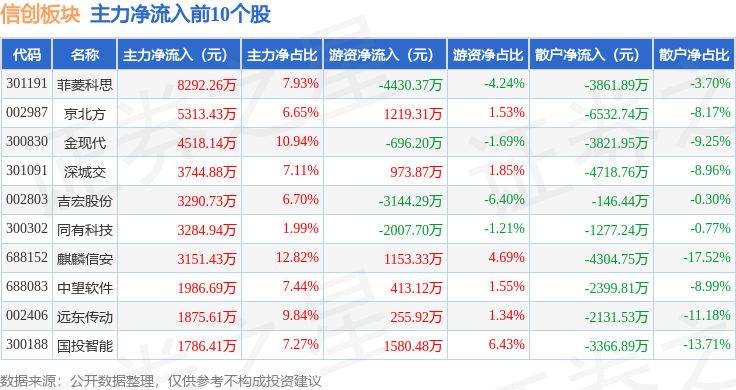 从资金流向上来看,当日信创板块主力资金净流出118.06亿元,游资资金净流入33.81亿元,散户资金净流入84.25亿元。信创板块个股资金流向见下表: