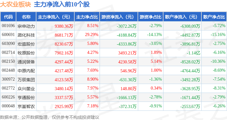 从资金流向上来看,当日大农业板块主力资金净流出10.19亿元,游资资金净流入2.6亿元,散户资金净流入7.59亿元。大农业板块个股资金流向见下表: