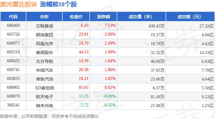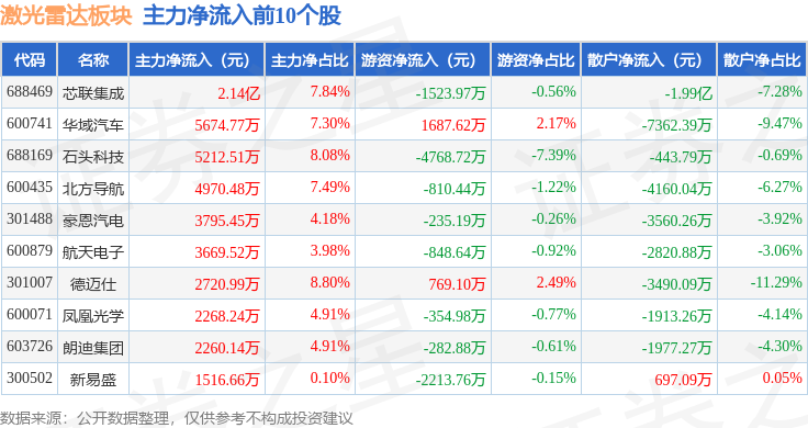 从资金流向上来看,当日激光雷达板块主力资金净流出76.67亿元,游资资金净流入25.97亿元,散户资金净流入50.7亿元。激光雷达板块个股资金流向见下表: