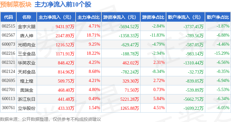 从资金流向上来看,当日预制菜板块主力资金净流出2.79亿元,游资资金净流入9200.93万元,散户资金净流入1.87亿元。预制菜板块个股资金流向见下表: