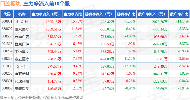 从资金流向上来看,当日口腔板块主力资金净流出8.38亿元,游资资金净流入6130.06万元,散户资金净流入7.76亿元。口腔板块个股资金流向见下表: