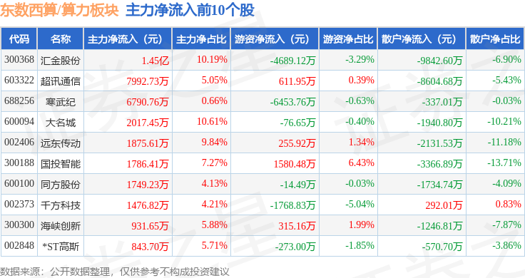 从资金流向上来看,当日东数西算/算力板块主力资金净流出155.37亿元,游资资金净流入33.68亿元,散户资金净流入121.69亿元。东数西算/算力板块个股资金流向见下表: