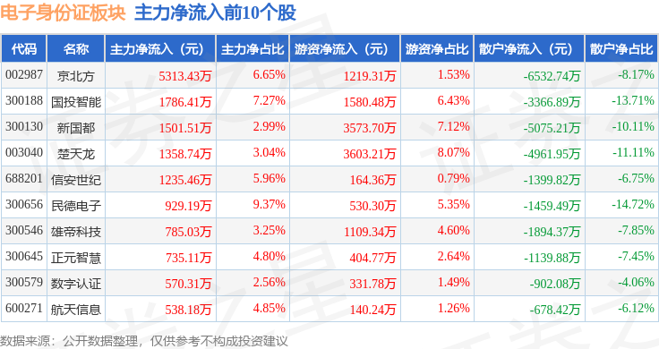 从资金流向上来看,当日电子身份证板块主力资金净流出1.84亿元,游资资金净流入2.38亿元,散户资金净流出5399.96万元。电子身份证板块个股资金流向见下表: