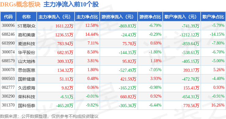 从资金流向上来看,当日DRGs概念板块主力资金净流出5.65亿元,游资资金净流出2205.1万元,散户资金净流入5.87亿元。DRGs概念板块个股资金流向见下表:
