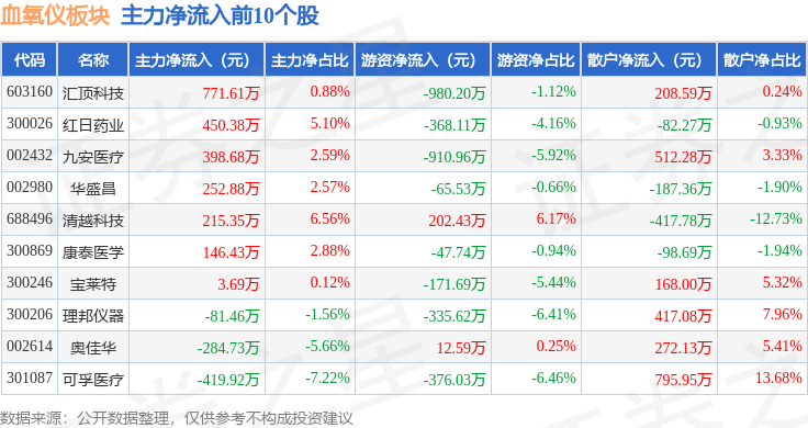 从资金流向上来看,当日血氧仪板块主力资金净流出4994.06万元,游资资金净流出1796.1万元,散户资金净流入6790.15万元。血氧仪板块个股资金流向见下表: