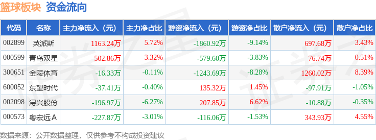从资金流向上来看,当日篮球板块主力资金净流入1187.52万元,游资资金净流出3457.1万元,散户资金净流入2269.57万元。篮球板块个股资金流向见下表: