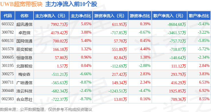 从资金流向上来看,当日UWB超宽带板块主力资金净流出13.88亿元,游资资金净流入2.71亿元,散户资金净流入11.18亿元。UWB超宽带板块个股资金流向见下表:
