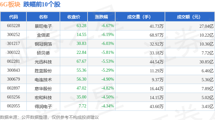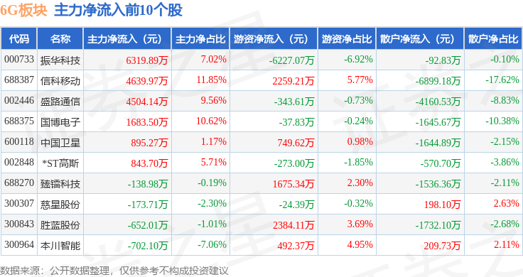 从资金流向上来看,当日6G板块主力资金净流出21.01亿元,游资资金净流入2.67亿元,散户资金净流入18.34亿元。6G板块个股资金流向见下表: