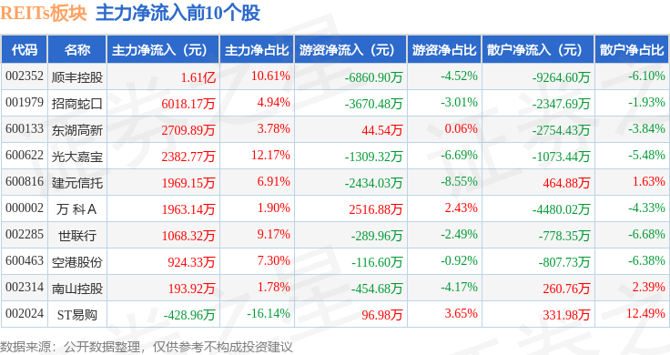 从资金流向上来看,当日REITs板块主力资金净流出3.36亿元,游资资金净流出7570.24万元,散户资金净流入4.12亿元。REITs板块个股资金流向见下表: