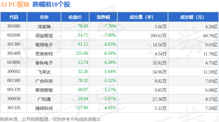 证券之星消息,9月26日AI PC板块较上一交易日下跌3.34%,鸿富瀚领跌。当日上证指数报收于3828.11,下跌0.65%。深证成指报收于13209.0,下跌1.76%。AI PC板块个股涨跌见下表: