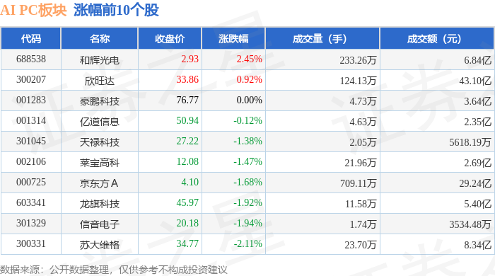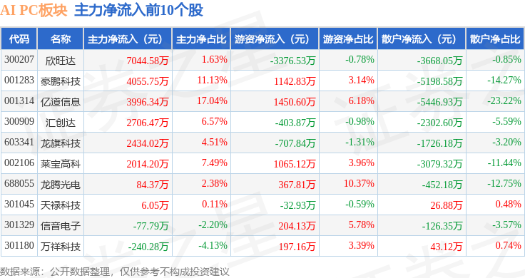 从资金流向上来看,当日AI PC板块主力资金净流出35.67亿元,游资资金净流入6.11亿元,散户资金净流入29.56亿元。AI PC板块个股资金流向见下表: