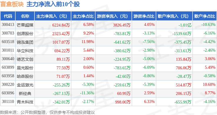 从资金流向上来看,当日盲盒板块主力资金净流出3.65亿元,游资资金净流入2.85亿元,散户资金净流入7982.62万元。盲盒板块个股资金流向见下表: