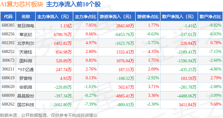 从资金流向上来看,当日AI算力芯片板块主力资金净流出37.7亿元,游资资金净流入20.1亿元,散户资金净流入17.6亿元。AI算力芯片板块个股资金流向见下表: