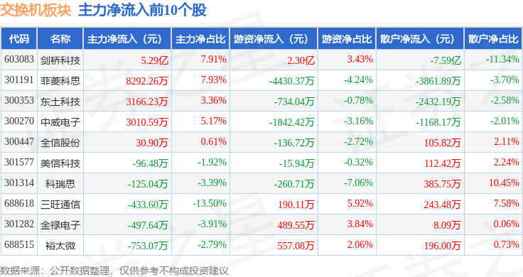 从资金流向上来看,当日交换机板块主力资金净流出29.51亿元,游资资金净流入10.39亿元,散户资金净流入19.11亿元。交换机板块个股资金流向见下表: