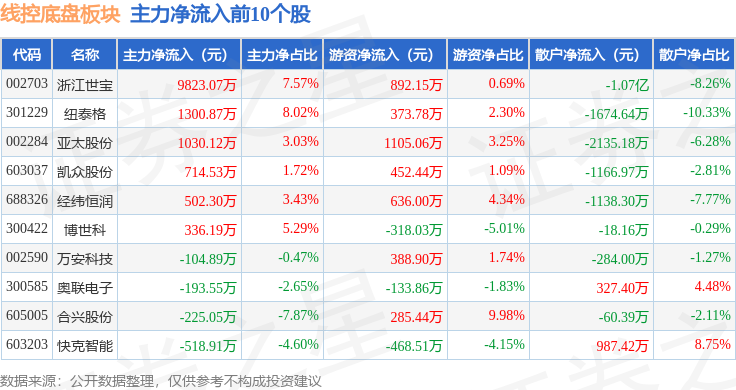 从资金流向上来看,当日线控底盘板块主力资金净流出1.4亿元,游资资金净流入1669.57万元,散户资金净流入1.23亿元。线控底盘板块个股资金流向见下表: