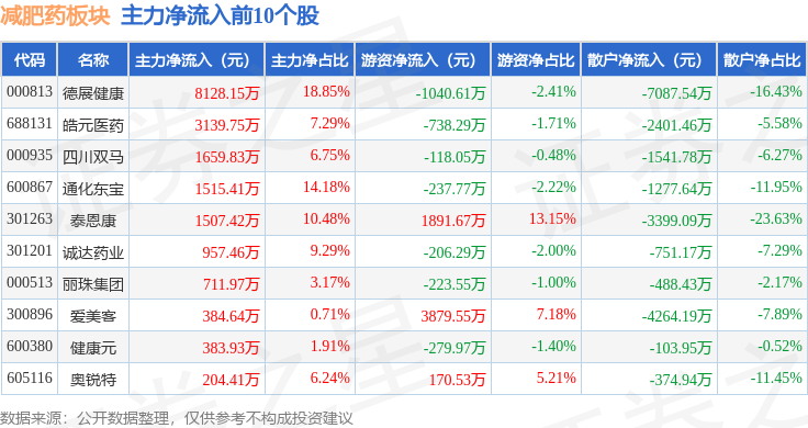 从资金流向上来看,当日减肥药板块主力资金净流出13.97亿元,游资资金净流入4.06亿元,散户资金净流入9.91亿元。减肥药板块个股资金流向见下表:
