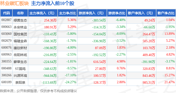 从资金流向上来看,当日林业碳汇板块主力资金净流出5815.3万元,游资资金净流入190.21万元,散户资金净流入5625.09万元。林业碳汇板块个股资金流向见下表: