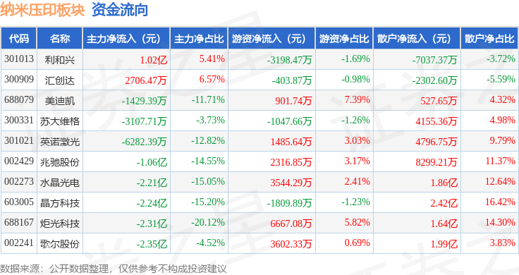 从资金流向上来看,当日纳米压印板块主力资金净流出9.96亿元,游资资金净流入1.21亿元,散户资金净流入8.75亿元。纳米压印板块个股资金流向见下表: